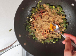 Thereafter, add the turmeric powder. Add the frozen bhindi as soon as the turmeric begins to sizzle.