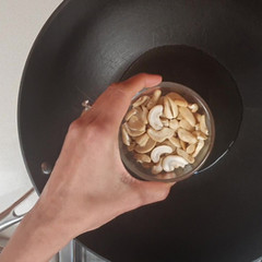 Collect the roasted cashews on a separate dish for later use, and keep the extra oil in the wok to finish cooking the subji in the following step
